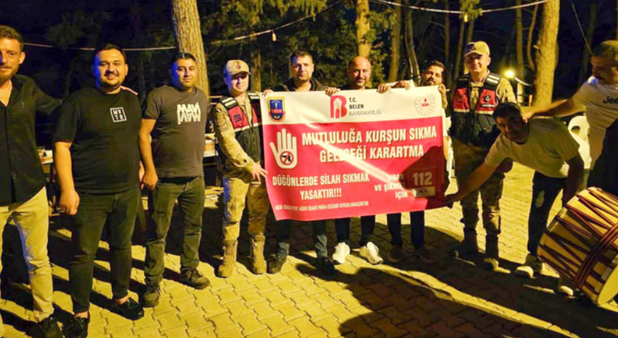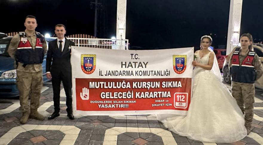 Hatay İl Jandarma Komutanlığı'nın başlattığı “Silahsız düğün, silahsız eğlence” kampanyası, düğün ve asker eğlencelerinde aktif tanıtımlarla sürdürülüyor. İl genelinde yürütülen farkındalık çalışmaları kapsamında, jandarma ekipleri düğünleri tek tek ziyaret ederek “Mutluluğa kurşun sıkma, geleceği karartma” mesajını gelin ve damatlarla birlikte veriyor.