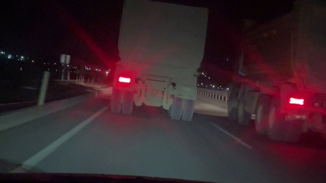 Asrın felaketi sonrası Hatay'da trafikte sayıları artan mikser ve hafriyat kamyonları trafiği zaman zaman tehlikeye düşürüyor. Antakya ilçesi havaalanı yolunda 2 hafriyat kamyonunun yarıştığı anlar trafikteki başka bir araç sürücüsü tarafından görüntülendi. Arkalarından seyreden ve hızları 100 kilometreyi bulan kamyonların o anları anbean görüntülendi. Görüntülerde; araç sürücüsünün selektör yapmasına rağmen kamyon sürücülerinin umursamadığı görüldü.