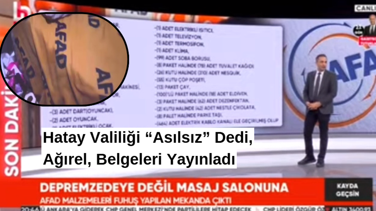 Hatay'da gündeme bomba gibi düşen skandal iddialar, kamuoyunda infial yarattı. Cumhuriyet gazetesi yazarı Murat Ağırel’in ortaya attığı ve belgeleriyle canlı yayında paylaştığı “AFAD malzemeleri fuhuş yuvasında kullanıldı” iddiası, yetkilileri zor durumda bıraktı. Hatay Valiliği söz konusu iddiaları yalanlarken, Ağırel, canlı yayında görüntüler eşliğinde “Sayın Vali gereğini yapmalı” çağrısında bulundu.