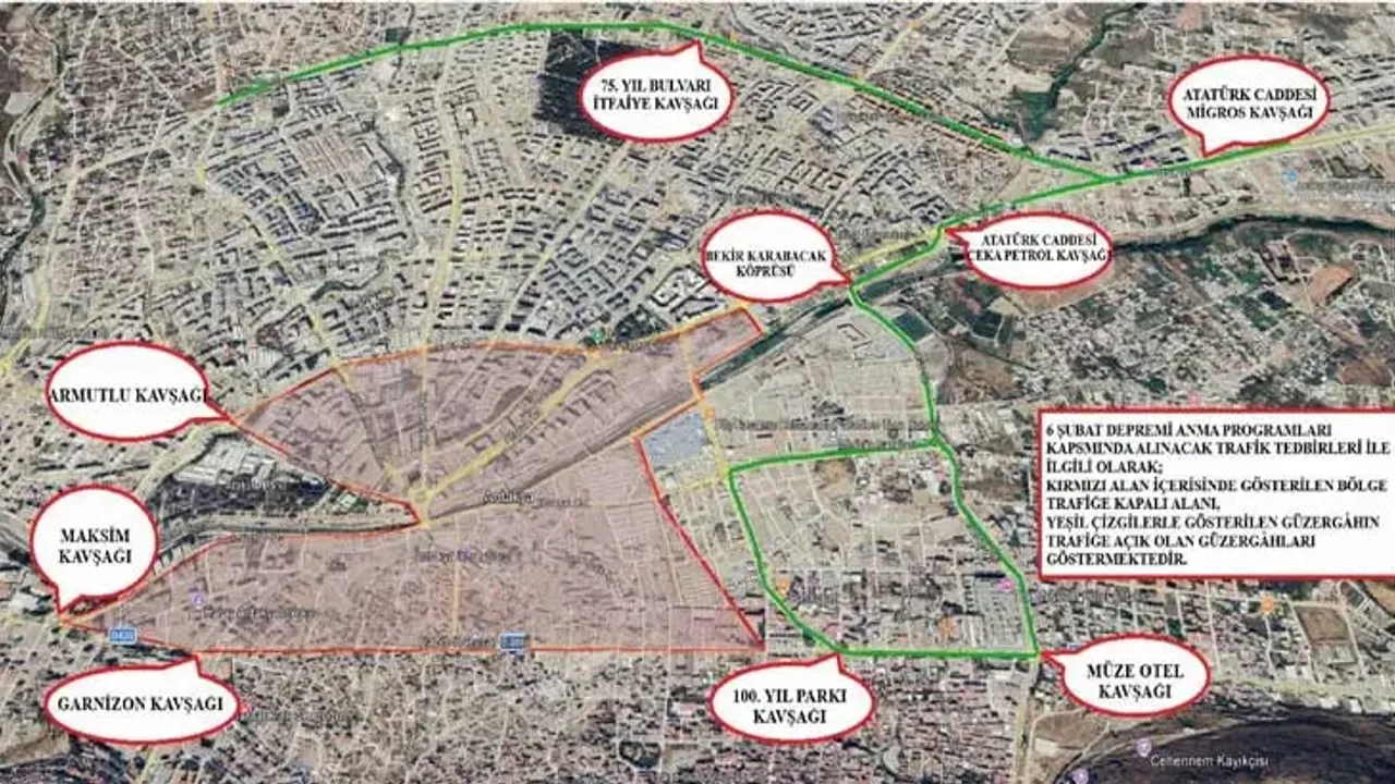 Hatay Valiliği, 6 Şubat 2023 depremlerinin 3. yıl dönümü kapsamında düzenlenecek anma etkinlikleri dolayısıyla trafik düzenlemeleri yapılacağını duyurdu.