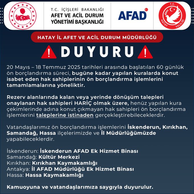 Hatay İl Afet ve Acil Durum Müdürlüğü, 20 Mayıs – 18 Temmuz 2025 tarihleri arasında yürütülen 60 günlük ön borçlandırma sürecine dair önemli bir duyuru yayımladı. Yapılan açıklamaya göre, bugüne kadar yapılan kurada konut isabet eden hak sahiplerinin ön borçlandırma işlemlerini tamamlamaları gerekiyor.