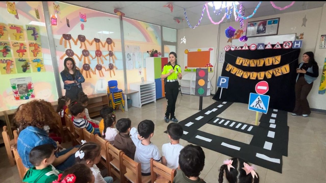 İl Emniyet Müdürlüğü Trafik Denetleme Şubesi ekipleri, eğitim çalışmaları kapsamında Renkli Düşler Anaokulu'nu ziyaret etti. Ekipler, bir araya geldikleri öğrencilere trafik kuralları hakkında bilgi verdi. Araçlarda, yaya geçitlerinde ve kaldırımlarda dikkat edilmesi gereken konuları anlatan polis, miniklerin sorularını da yanıtladı.