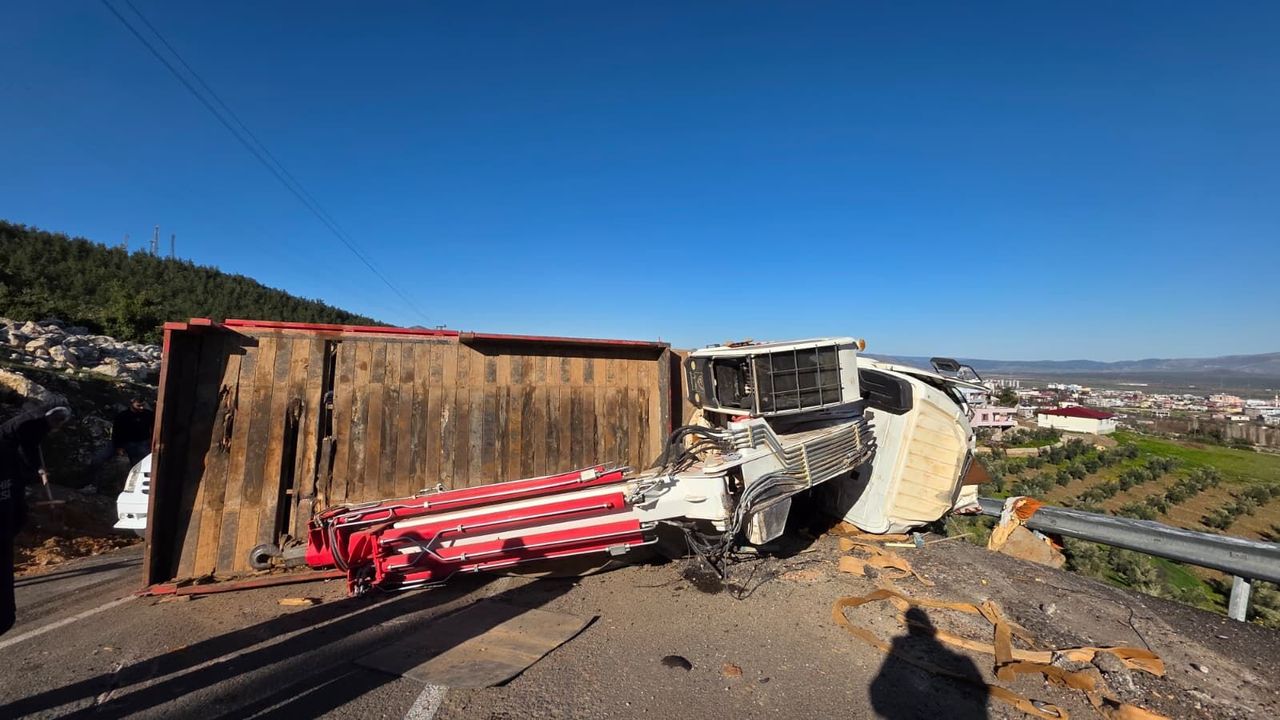 M.A. idaresindeki 01 ANJ 934 plakalı vinç, Mağaralar mevkisindeki yolda sürücüsünün kontrolünden çıkıp devrildi.