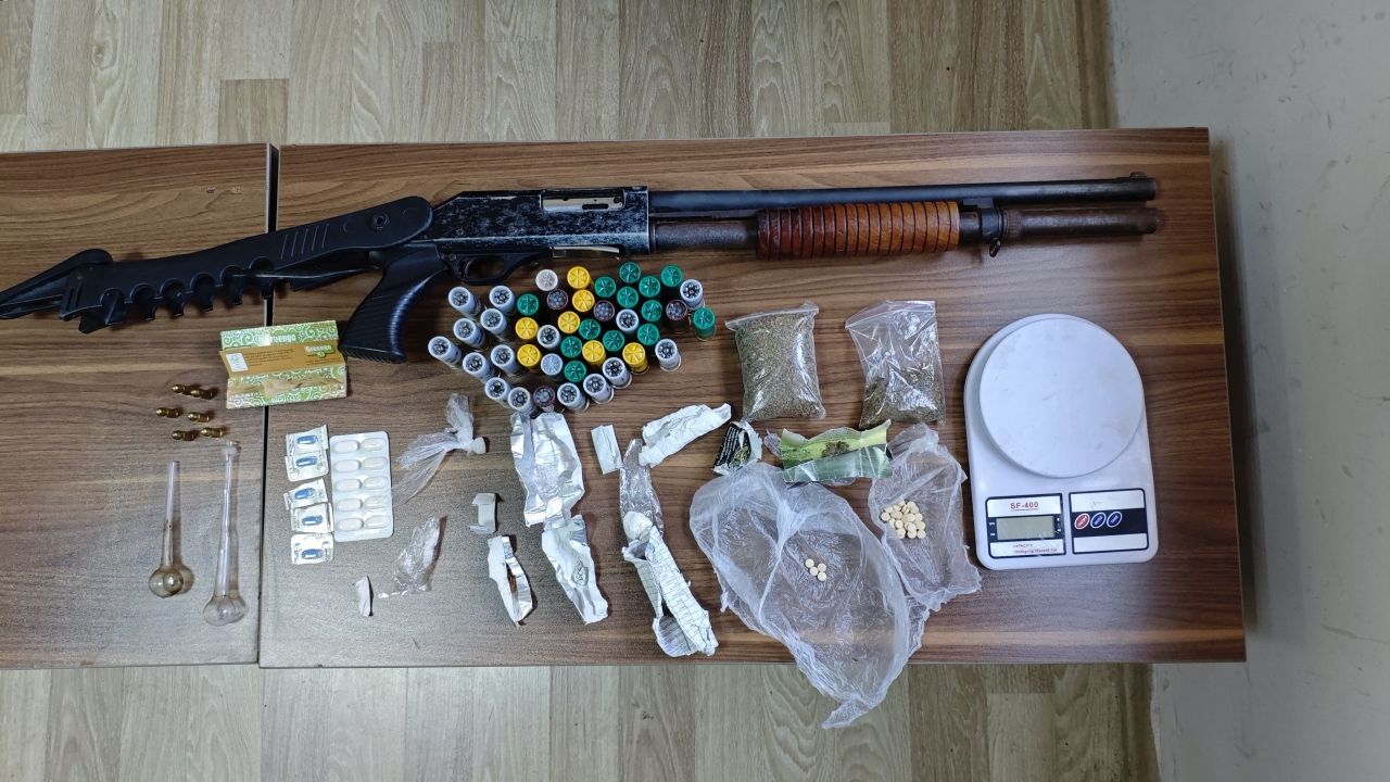 Adreste 40 gram esrar, 49 uyuşturucu hap, ruhsatsız tüfek, 42 fişek, 6 mermi ve hassas terazi ele geçirildi.