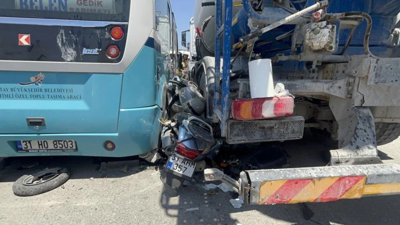 Kaza, 31 TK 947 plakalı beton mikseri ile 31 HO 8503 plakalı minibüsün aynı yönde seyir halindeyken gerçekleşti. Bu araçların arasında kalan 31 AHM 357 plakalı motosikletin sürücüsü K.K., çarpmanın etkisiyle iki araç arasında sıkıştı.