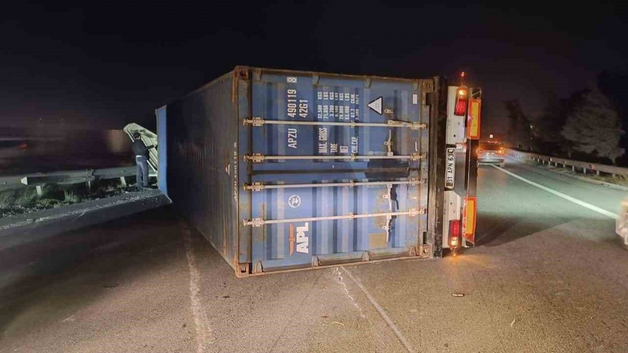 Hatay’da etkili olan fırtına nedeniyle kamyonet ve konteyner taşıyan tırlar devrildi.