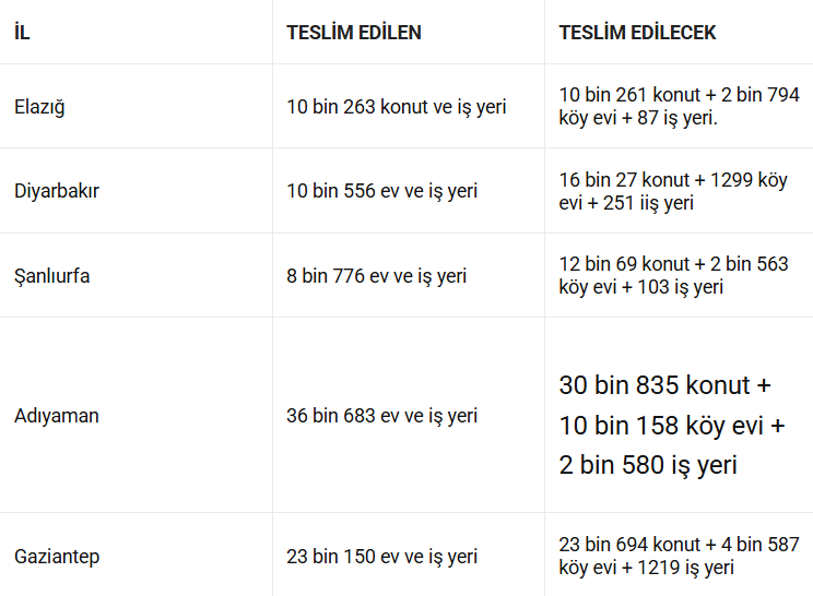 Diyarbakır, Elazığ, Şanlıurfa, Osmaniye, Adana, Kilis ve Sivas’ta da on binlerce konut ve iş yeri teslimleri sürüyor.