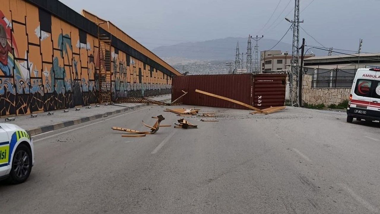 Olay, İskenderun - Payas yolu Akçay mevkiinde meydana geldi. Kuvvetli rüzgarın etkisiyle ilerleyen tırın üzerindeki konteyner yerinden koparak savruldu. Kontrolden çıkan konteyner, köprüden aşağı düşerek yolu tamamen trafiğe kapattı.