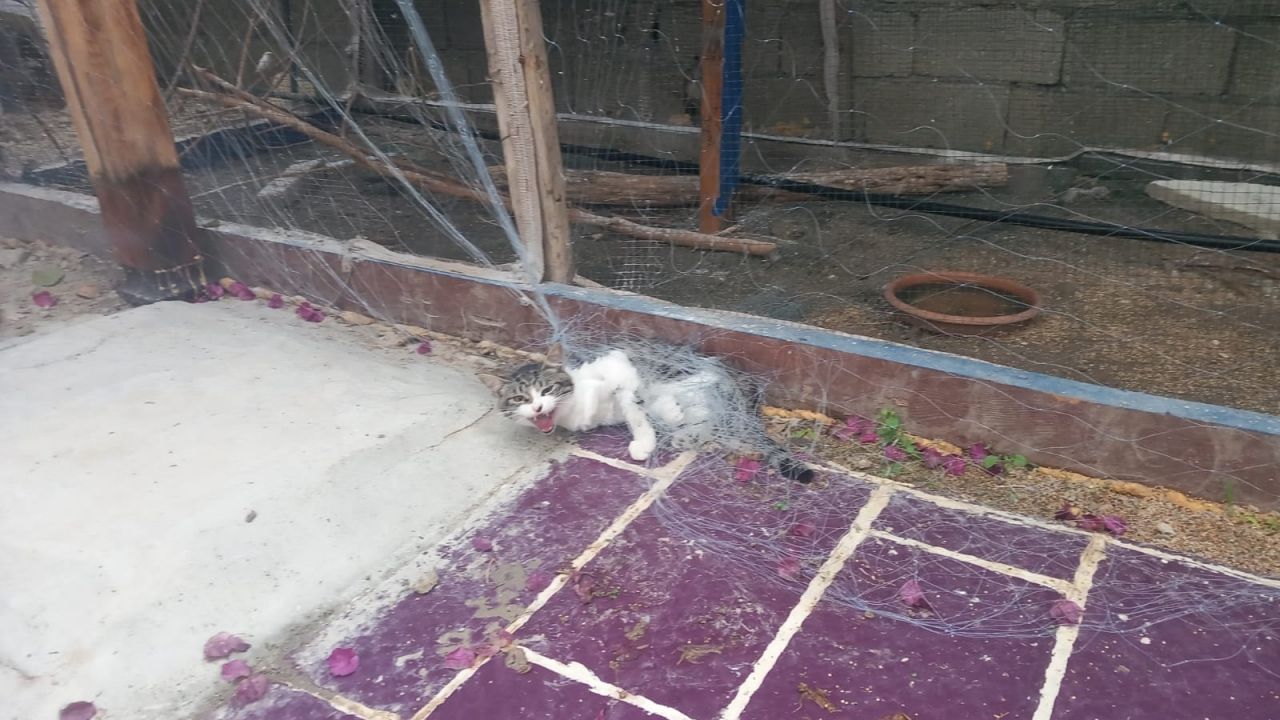 İhbar üzerine olay yerine sevk edilen Büyükşehir Belediyesi itfaiye ekibi, kedinin takıldığı ağı makasla kesti.