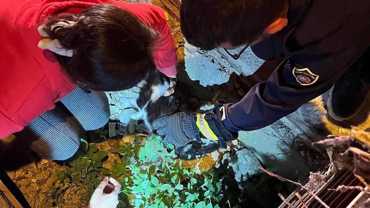Olay yerine gelen Büyükşehir Belediyesi itfaiye ekibi, mazgalı kaldırarak kediyi kurtardı.