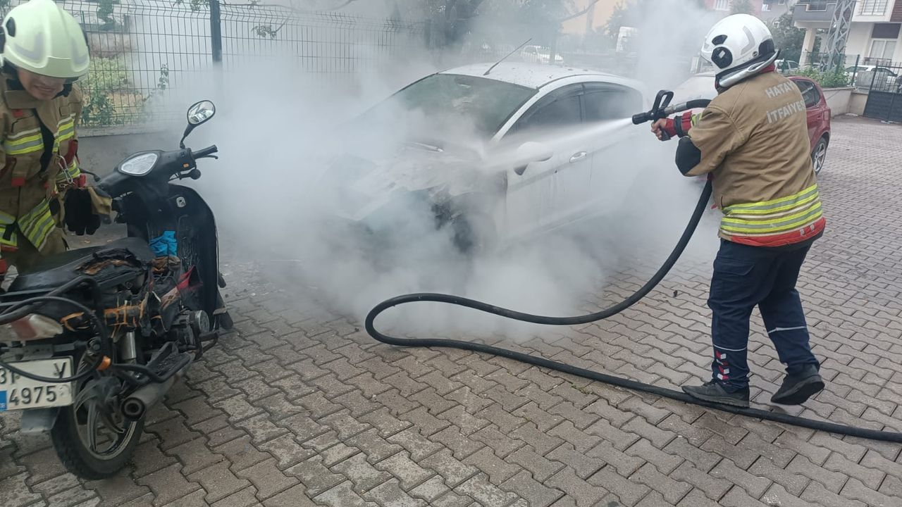 Karacami Mahallesi'nde park halindeki 31 GD 637 otomobilde henüz belirlenemeyen nedenle yangın çıktı.