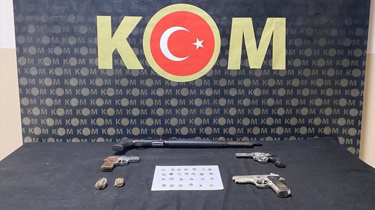 Şüphelilerin adresindeki aramada, kurusıkıdan çevirme namlusu açık tabanca, 2 kurusıkı tabanca, 2 şarjör, pompalı tüfek ve 6 gram esrar ele geçirildi.