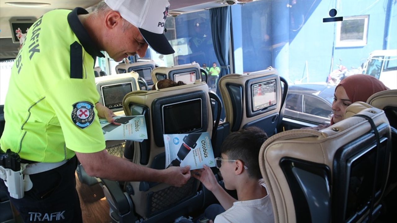 Otobüs şoförlerini trafik kurallarına uymaları konusunda uyaran ekipler, bilgilendirici broşür dağıttı.