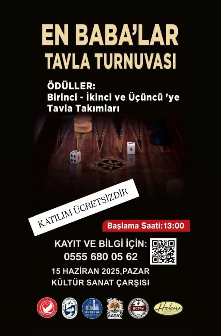 Hatay’da tavla severler 15 Haziran 2025 Pazar günü Kültür Sanat Çarşısı’nda düzenlenecek özel bir turnuvada buluşuyor. “En Baba’lar Tavla Turnuvası” adıyla organize edilen etkinlik, saat 13:00’te başlayacak.