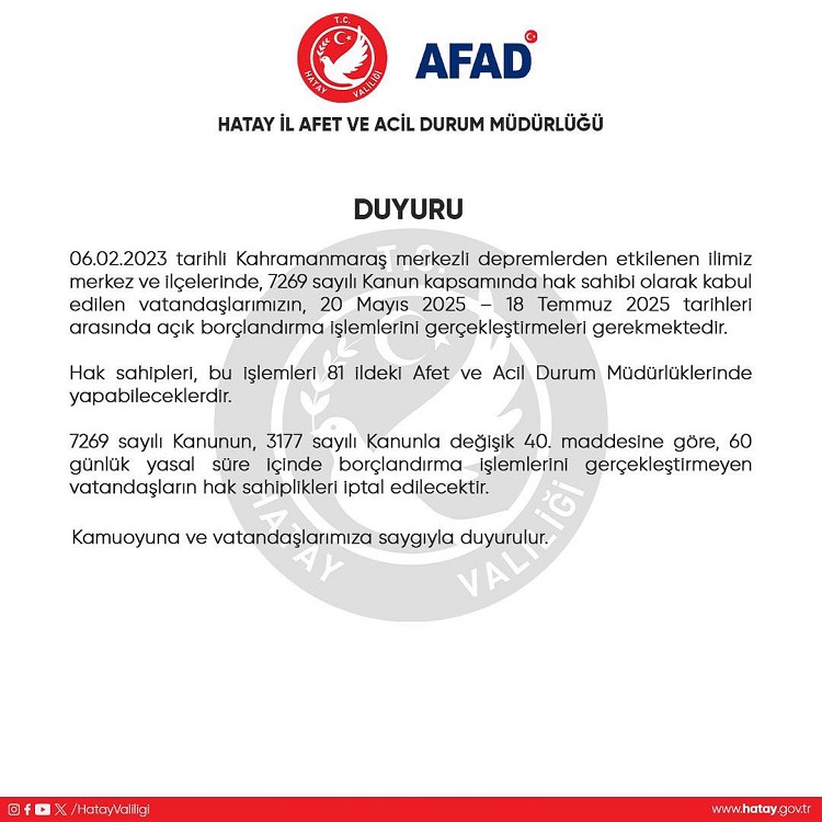 Hatay İl Afet ve Acil Durum Müdürlüğü, 6 Şubat 2023 tarihinde meydana gelen Kahramanmaraş merkezli depremler sonrası hak sahibi olarak kabul edilen vatandaşların borçlandırma işlemleri için son tarihi açıkladı. Açıklamaya göre, hak sahiplerinin 20 Mayıs 2025 – 18 Temmuz 2025 tarihleri arasında borçlandırma işlemlerini tamamlamaları gerekiyor.