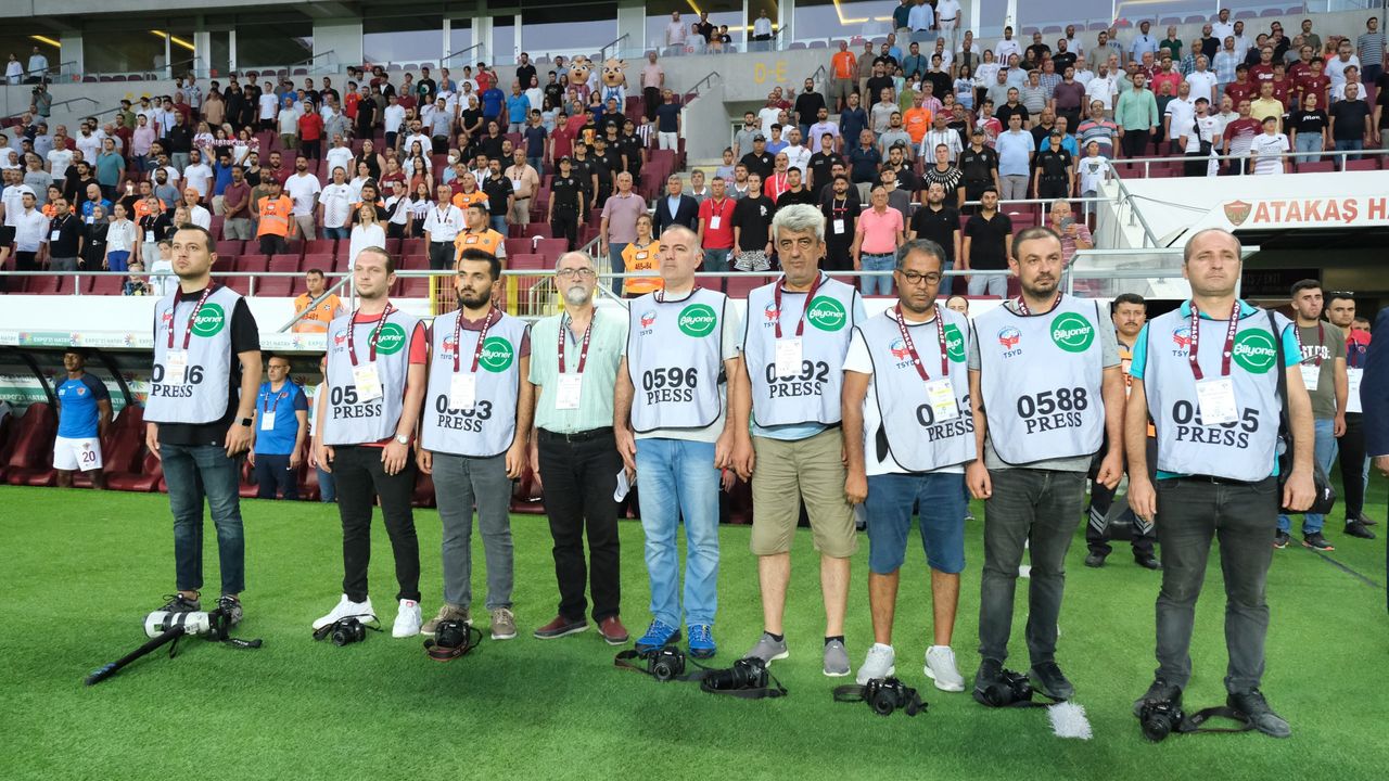 Süper Lig ekibi 3.Hafta Atakaş Hatayspor ile Gaziantep FK karşılaşması öncesinde sahada görev yapan spor muhabirleri Gaziantep-Nizip otoyolunda meydana gelen kazada yaşamını kaybeden meslektaşları İhlas Haber Ajansı ekibinden Muhammed Abdulkadir Esen ile Umut Yakup Tanrıöver için saygı duruşunda bulundular.