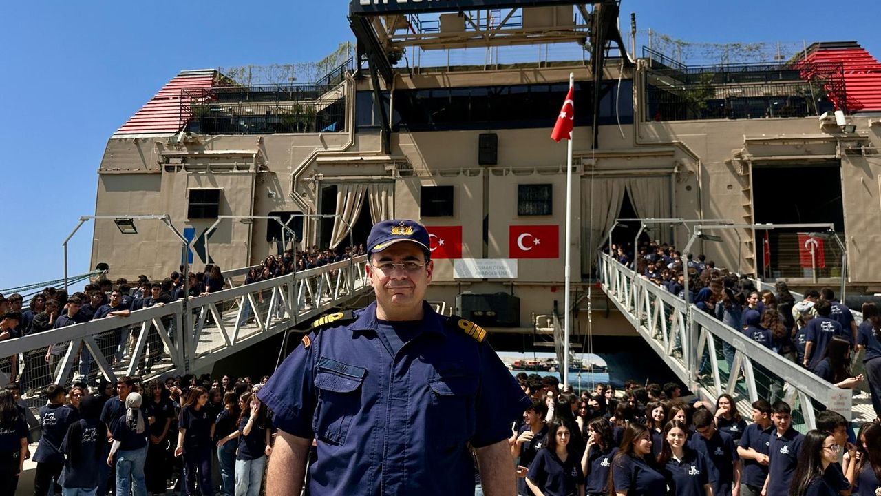 Hatay’daki 6 Şubat 2023 depremlerinin ardından ağır hasar alan Osman Ötken Anadolu Lisesi, eğitim faaliyetlerine Karadeniz Holding’e ait Rauf Bey Gemisi’nde devam ediyor. Bu süreçte okulun güvenliğini sağlayan isim ise yıllar önce bu sıralardan mezun olan Sahil Güvenlik Doğu Akdeniz Grup Komutanı Yarbay Onur Emir oldu.