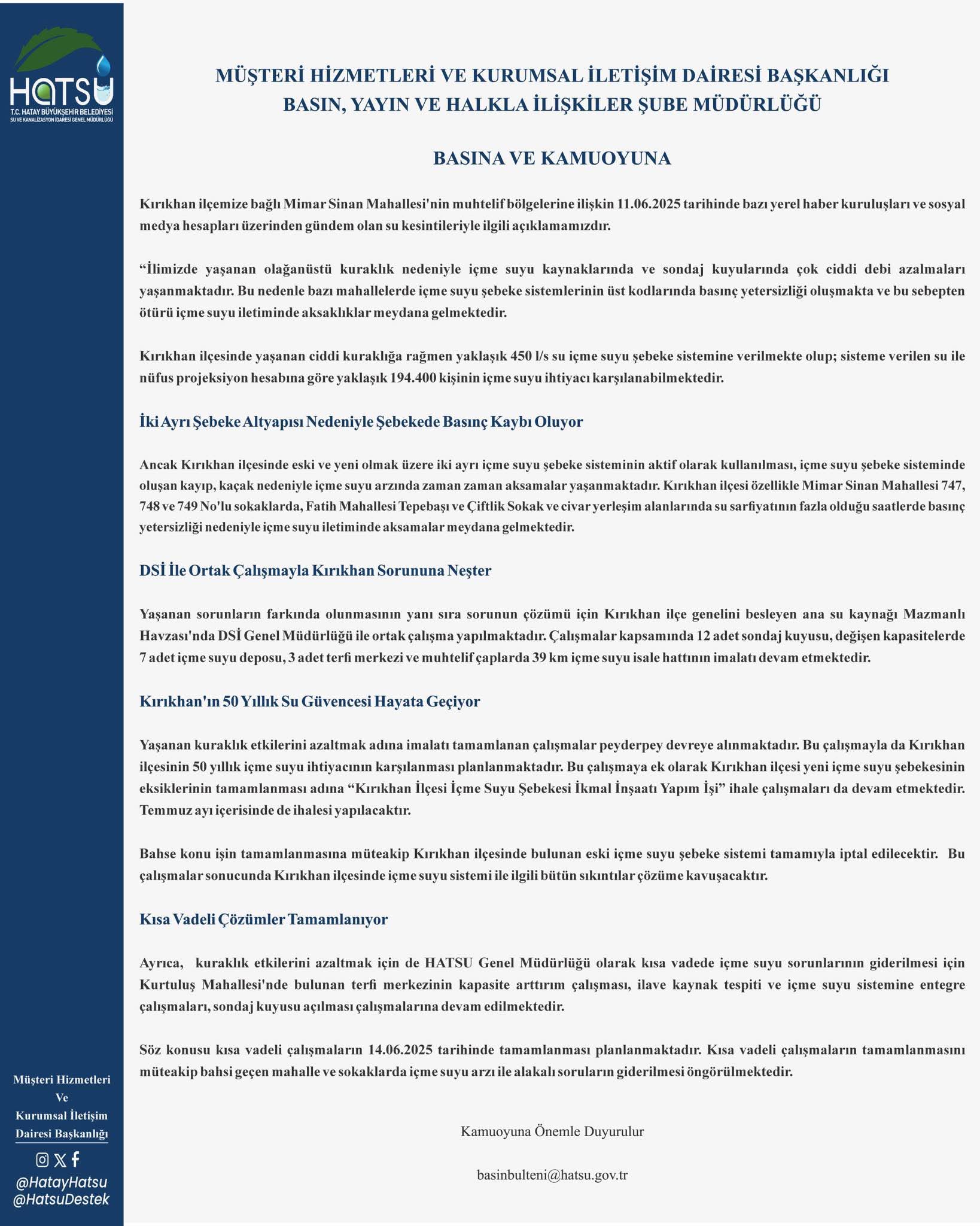 Hatay Su ve Kanalizasyon İdaresi (HATSU), Kırıkhan ilçesi Mimar Sinan Mahallesi'nde 11 Haziran 2025’te yaşanan su kesintilerine dair kamuoyunu bilgilendirdi. HATSU’dan yapılan açıklamada, bölgede yaşanan kuraklığın sondaj kuyularındaki su seviyelerini ciddi şekilde azalttığı, bu nedenle bazı mahallelere yeterli içme suyu basıncı ulaştırılamadığı bildirildi.