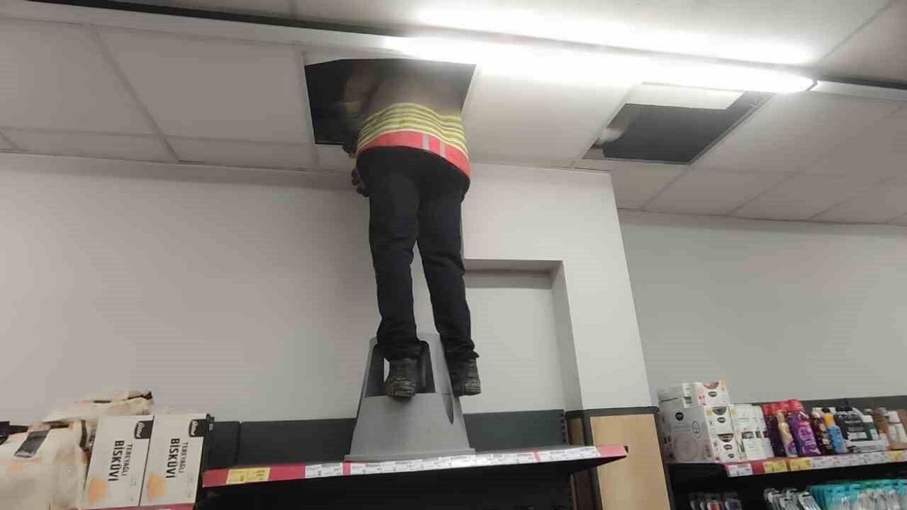 Hatay'da marketin havalandırma boşluğunda mahsur kalan kedi itfaiye ekiplerince kurtarıldı.