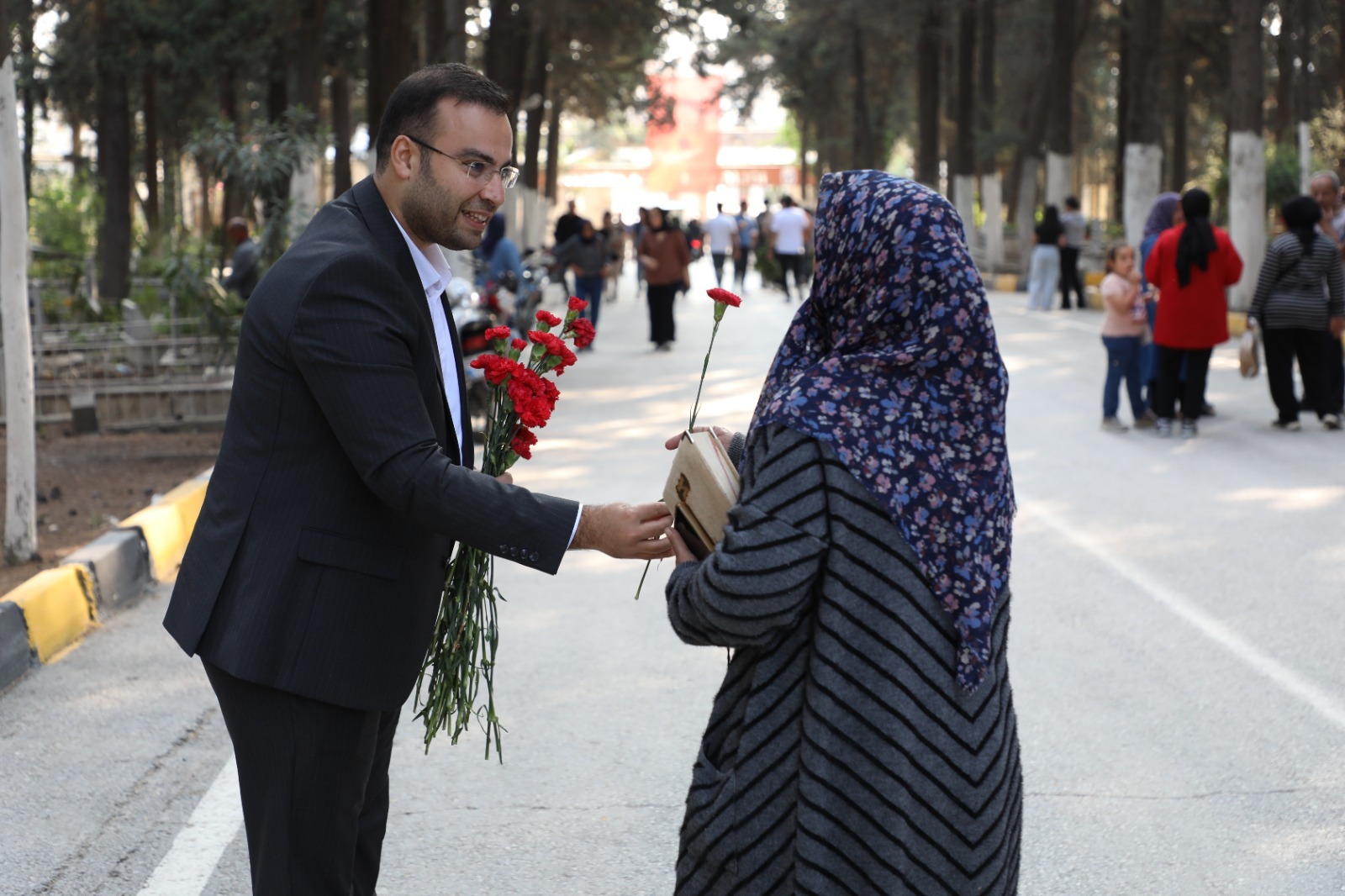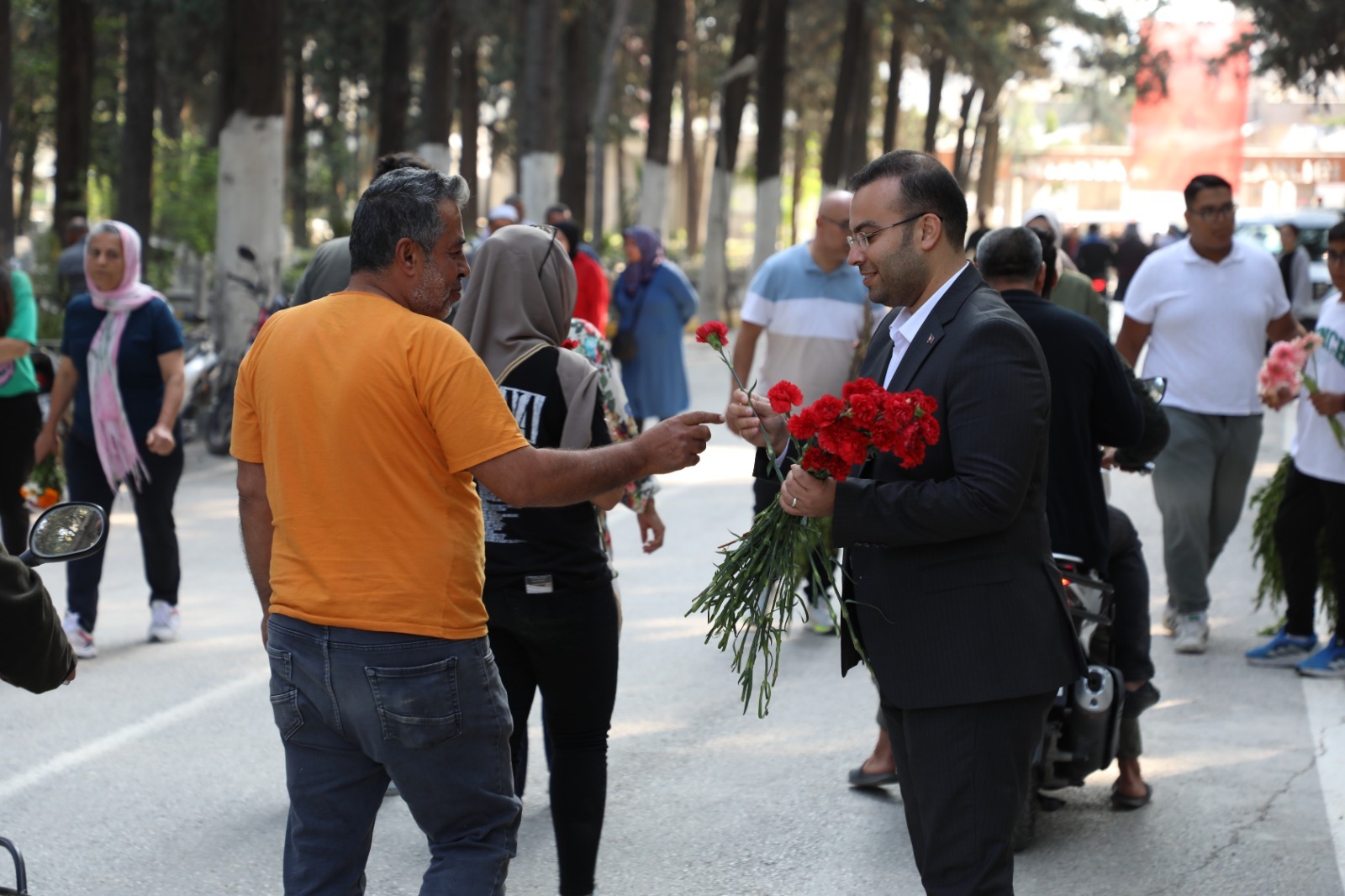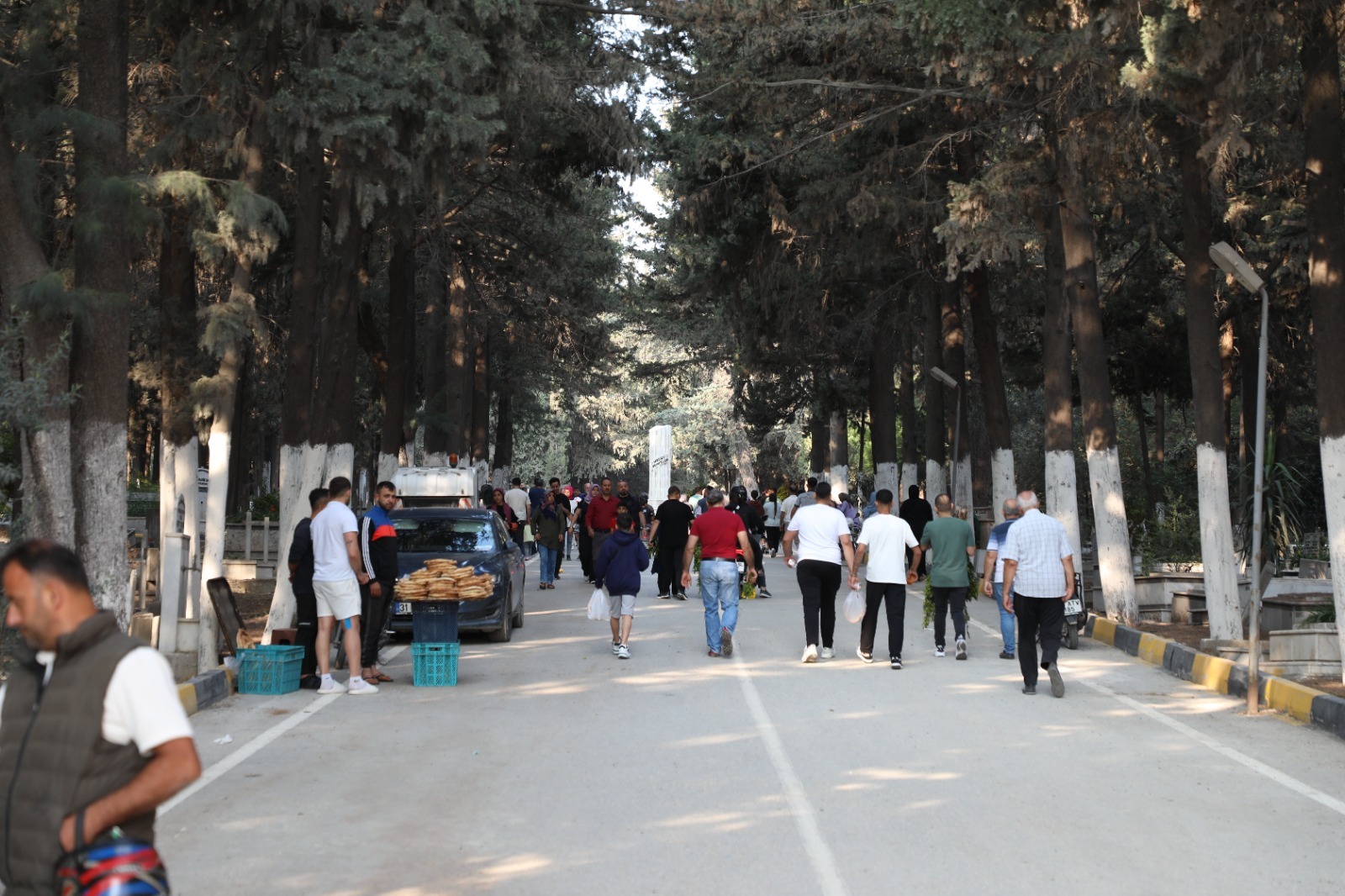 Bayramın ilk günü Antakya Asri Mezarlığı’na gelen vatandaşlar, HBB personelleri tarafından karşılandı. Kapıda ikramlarla karşılanan ziyaretçilere çiçek takdim edildi, bayramları kutlandı.