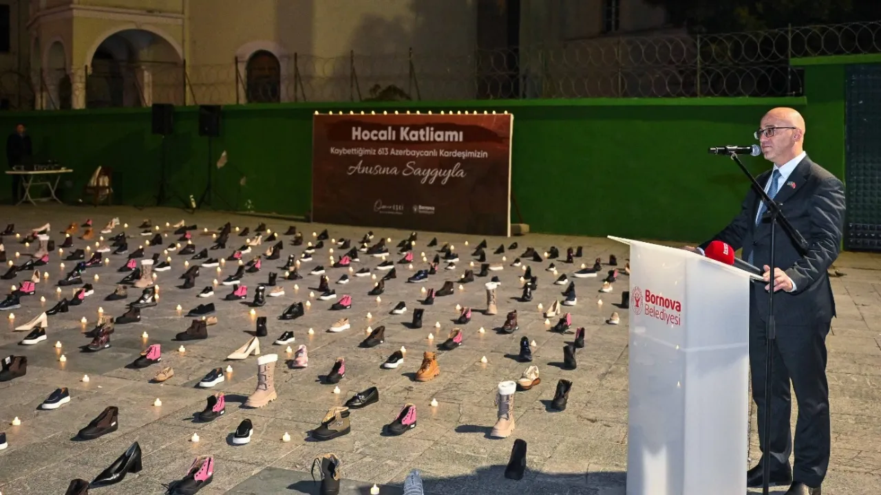 Karabağ Savaşı sırasında 26 Şubat 1992'de Azerbaycan’ın Hocalı kasabasında Ermenistan'a bağlı kuvvetler tarafından katledilen 613 Azerbaycanlı sivil, katliamı 33. yılında Bornova Belediyesi tarafından düzenlenen iki ayrı törenle anıldı.İZMİR (İGFA) - Gündüz saatlerinde Karacaoğlan Mahallesi'ndeki Azerbaycan Dostluk Parkı’nda başlayan anma programı, akşam saatlerinde Bornova Cumhuriyet Meydanı’nda devam etti. Katliamı dünyaya anlatan İranlı foto muhabiri Reza’nın Dostluk Parkı’ndaki “Yaralı Ruhlar” adlı sergisi büyük ilgi görürken, akşam düzenlenen anma etkinliğinde, katliamda hayatını kaybeden 613 kişiyi temsilen 613 çift siyah ayakkabı sergilendi. Alana yerleştirilen mumlar ise karanlıkta bir ışık gibi parlayarak Hocalı’nın unutulmaması gerektiğini hatırlattı.