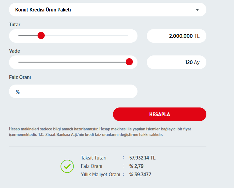 Önemli Not: Hesaplama araçları yalnızca bilgi amaçlıdır. Ziraat Bankası, faiz oranlarını ve kredi koşullarını değiştirme hakkını saklı tutar. Güncel faiz oranları ve kredi detayları için banka şubeleriyle iletişime geçilmesi tavsiye edilir.