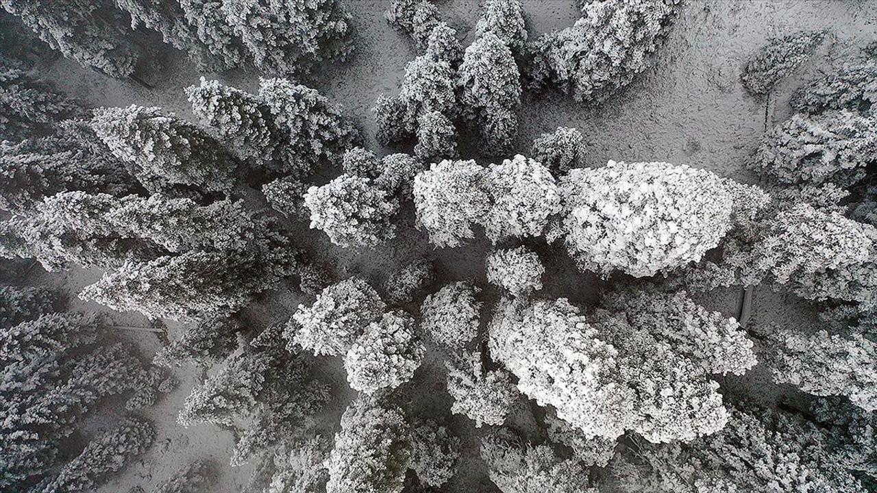 Güzel görüntü oluşturan ormandaki kar ve sis, dronla görüntülendi.