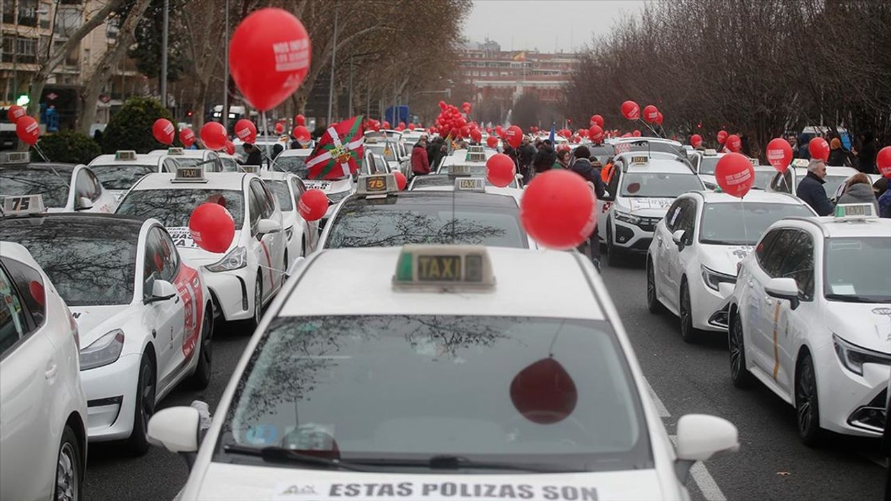 Ulaştırma Bakanlığı binasından Ekonomi Bakanlığı binasına kadar olan Castellana Bulvarı'ndaki alanı tamamen araçlarıyla dolduran taksiciler, araç sigorta poliçelerindeki artış oranının Tüketici Fiyat Endeksi (TÜFE) ile sınırlı tutulması çağrısında bulundu.