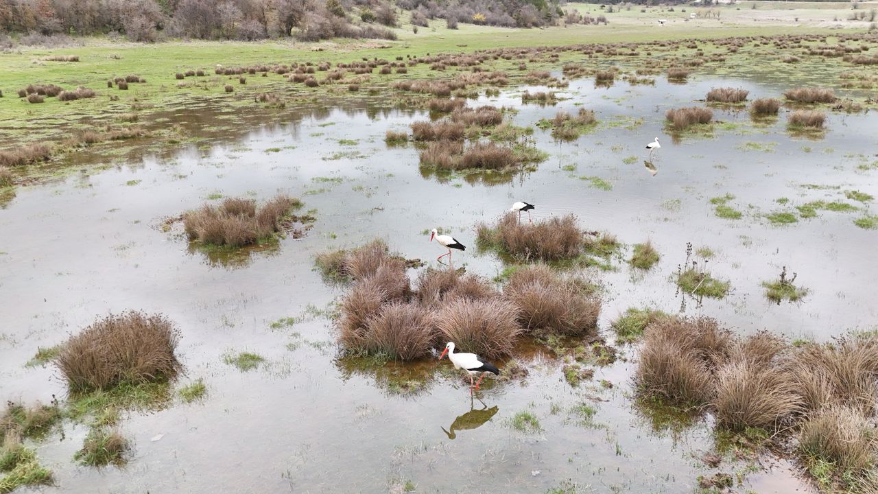 Leyleklerin sulak alanda dolaşmaları ve yiyecek aramaları dronla görüntülendi.