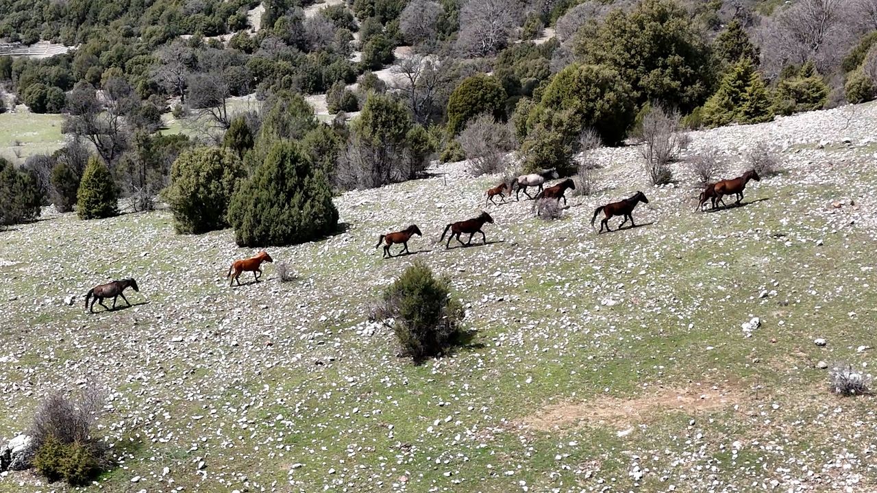 ISPARTA (AA) - Isparta'nın Sütçüler ilçesi kırsalında sürüler halinde yaşayan ve ilkbaharın gelmesiyle meralarda otlayan yılkı atları dronla görüntülendi.