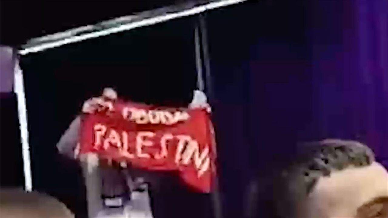 'Gazze Hareketi' isimli grup da salonda 'AWS soykırıma yatırım yapıyor' yazılı döviz açtı.