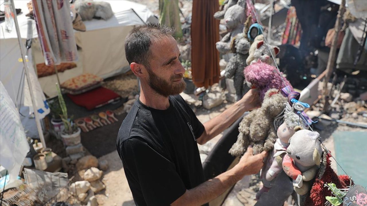 "Sürekli evimin yıkıntıları arasında ailem ve komşularımdan kalan yadigarları arıyorum. Bulduğum oyuncakları ipe astım. Çocuklarımı çok özlüyorum ve bu oyuncaklarla özlem gideriyorum.