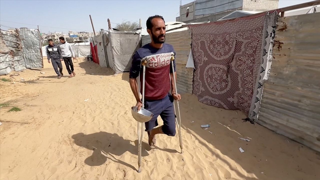 İsrail saldırılarında sağ bacağını kaybeden baba Lafi de 6 kişilik ailesine bakabilmek için bu kuyruklarda beklemeye devam ediyor.
