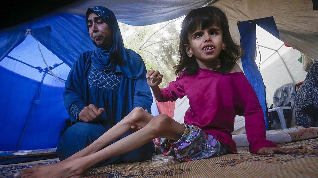 11 yaşındaki kız çocuğu yaklaşık 15 kilo kaybettiSağlık Bakanlığından ve medya ofisinden yapılan tüm çağrılara rağmen Gazze'deki çocukların durumu her geçen gün kötüye gidiyor. Gazze'nin orta kesimindeki Deyr el-Belah'ta bir çadırda yaşayan 11 yaşındaki Dena el-Hac, yetersiz beslenme sorunu yaşayan ve bir deri bir kemik kalan bedeniyle ölümle pençeleşen çocuklardan sadece biri.
