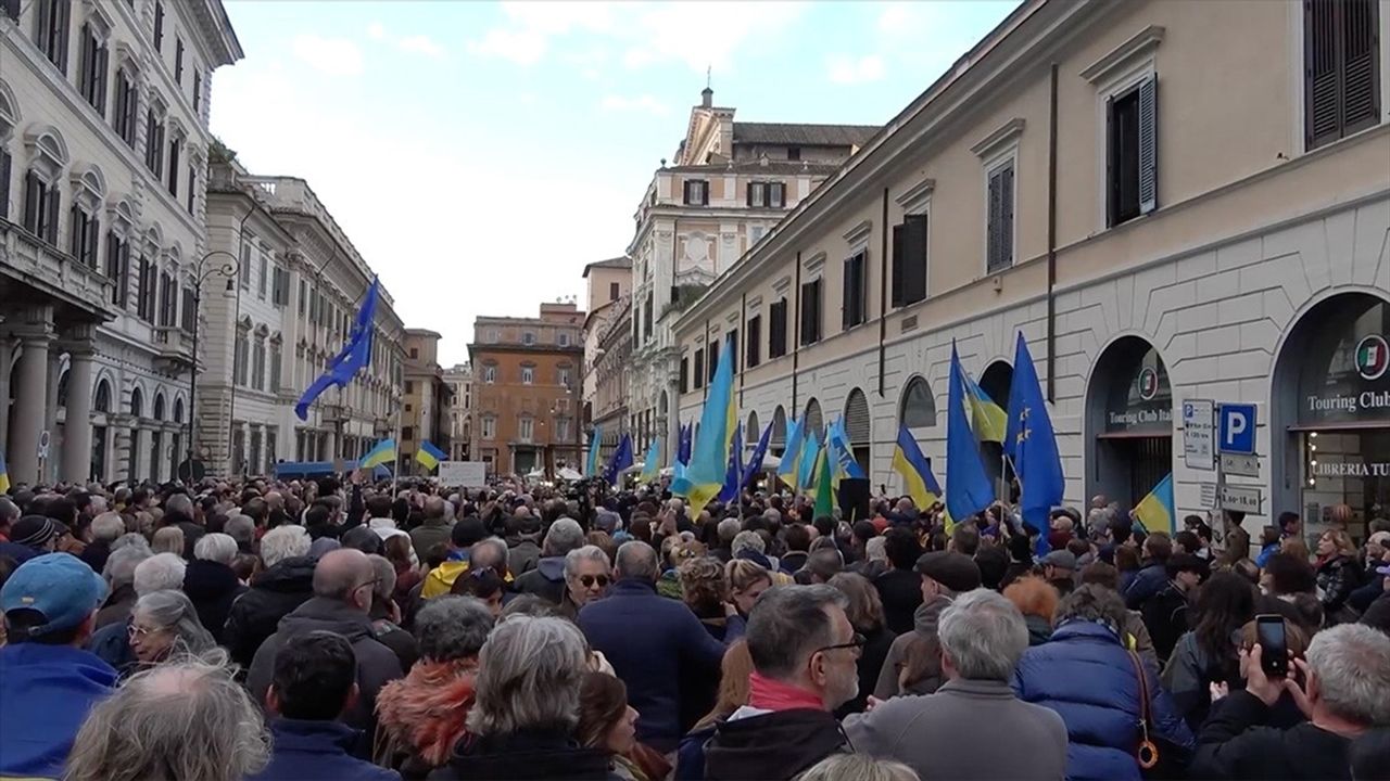 ROMA (AA) - Başkent Roma'daki Apostoli Meydanı'nda toplanan yüzlerce kişinin gösterisi, Ukrayna, İtalya ve Avrupa Birliği (AB) marşlarının çalınmasıyla başladı.