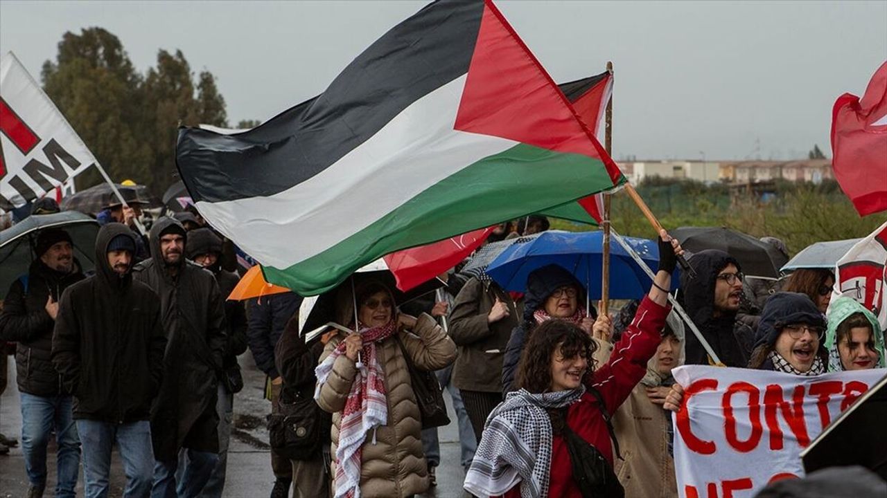 ROMA (AA) - Sicilya Adası'nda ABD üssü olmasına karşı çıkan, aralarında sol partiler, sivil toplum kuruluşları ve Filistin destekçilerinin bulunduğu birkaç yüz kişiden oluşan grup, Sigonella Üssü'nün girişinde yağışlı havaya rağmen gösteri düzenledi.