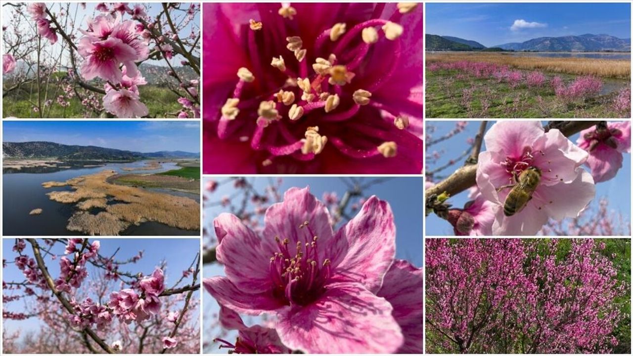Çiçek açan ağaçlar, pembe tonların hakim olduğu renkli görüntü oluşturdu.