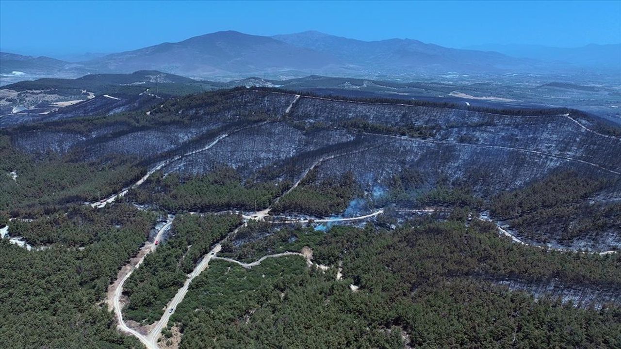 Yangında zarar gören alan dronla görüntülendi. Görüntülerde, ormanlık alanın alevler nedeniyle siyaha bürünmesi yer aldı.