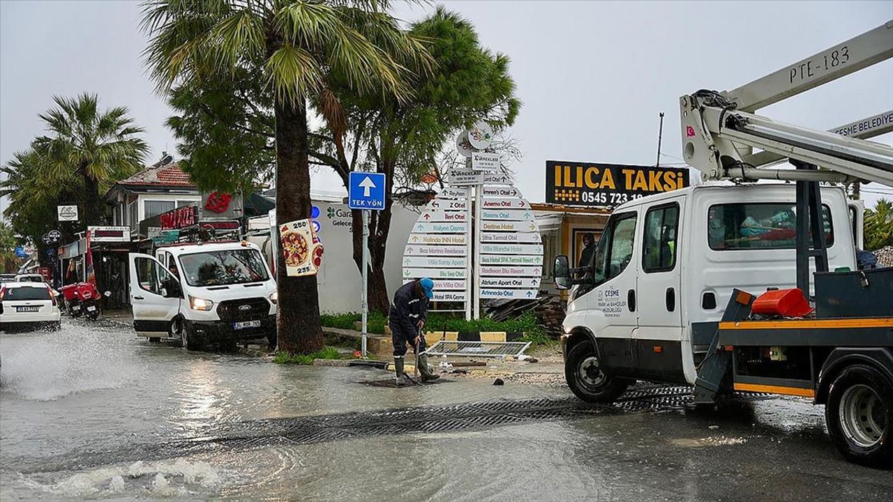 Çeşme Belediyesi ekipleri de yollarda biriken suyun tahliye edilmesi için çalışma başlattı.
