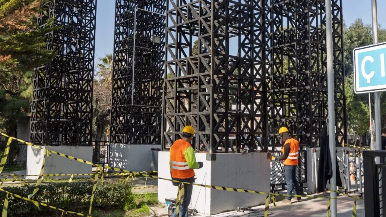 İzmir Büyükşehir Belediyesi Kültürpark 26 Ağustos Kapısı’nda güçlendirme çalışmalarına başladı. Çalışma kapsamında yapının yıpranan çelik aksamı sağlamlaştırılacak.İZMİR (İGFA) - İzmir Büyükşehir Belediyesi, Kültürpark’ın tarihi kapılarından 26 Ağustos Kapısı’nda güçlendirme çalışmasına başladı. Yapı İşleri Dairesi Başkanlığı ekipleri uzun yıllardır kente hizmet veren ve hava koşulları gibi çeşitli nedenlerle yıpranan tarihi kapının çelik aksamını güçlendirecek. Çalışmaların bir hafta içinde tamamlanması planlanıyor.