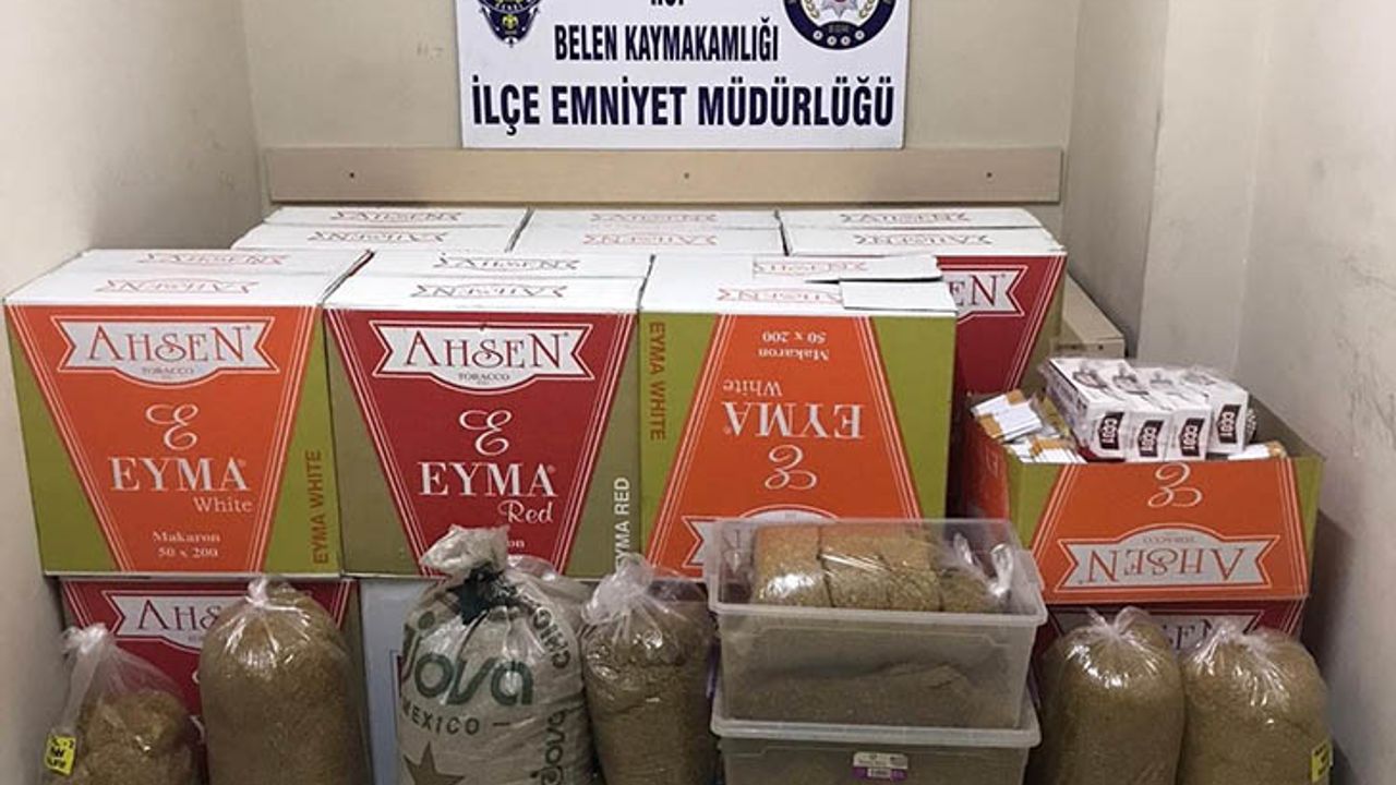 Yapılan aramada 1860 adet hazır sarılmış kaçak tütün, 40 kg kıyılmış tütün, 133.000 adet makaron ele geçirildi.