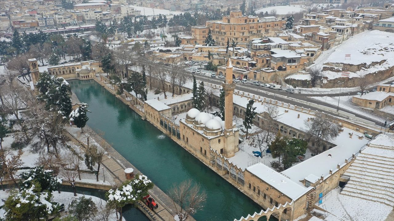 Beyaza bürünerek güzel görüntü oluşturan tarihi Balıkgöl Yerleşkesi, Şanlıurfa Kalesi, Kızılkoyun Nekropolü, Haleplibahçe Mozaik Müzesi ve Arkeoloji Müzesinin çevresi dron ile görüntülendi.