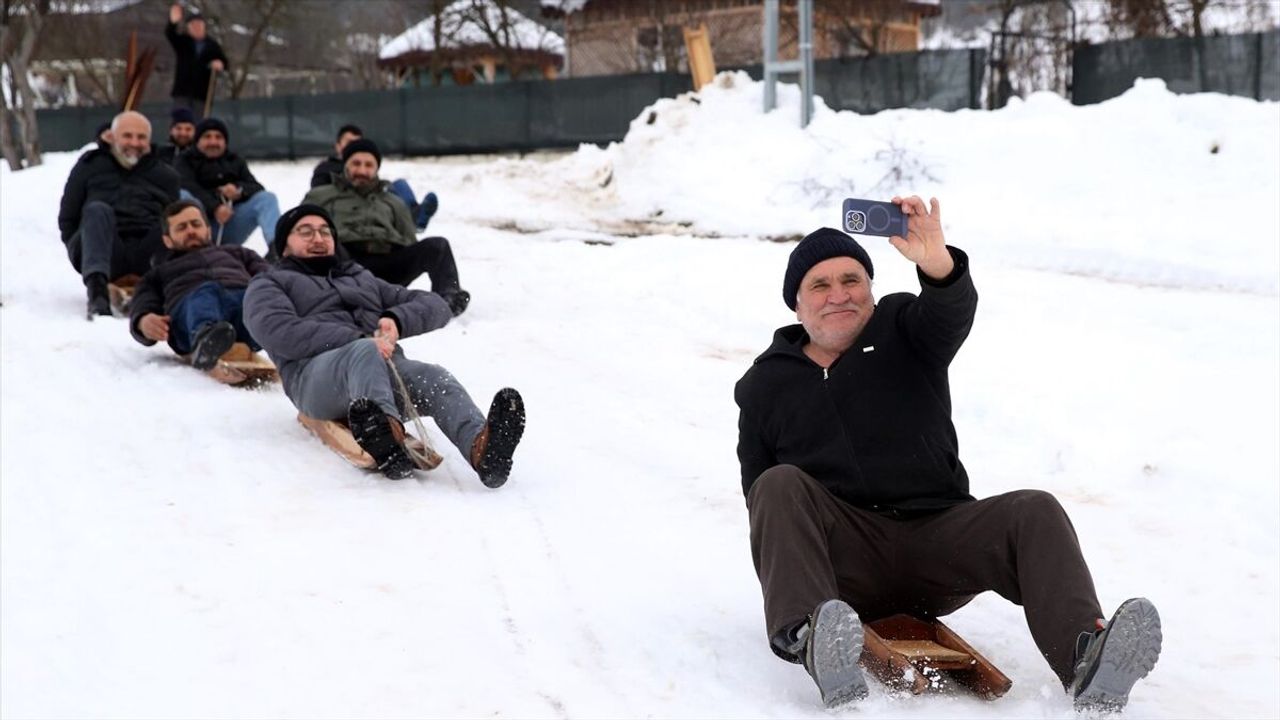 Köse'nin pisti hazırladığını duyan çevre köy ve ilçelerden vatandaşlar, burada 600 yıllık geçmişi olan geleneksel kızaklarla kayarak eğleniyor.