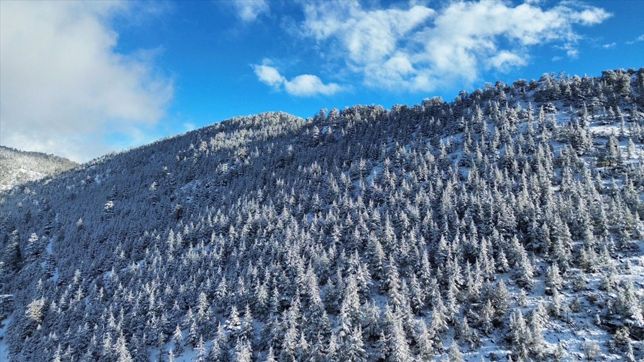 Karla kaplanan ormanlık alan ve kıvrılarak uzanan kara yolu, güzel görüntü oluşturdu.