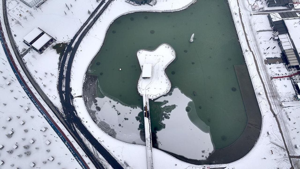 Millet bahçesinde bulunan gölet kısmen buz tuttu.
