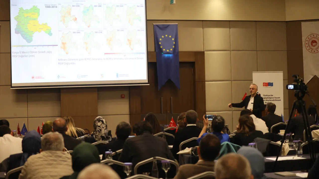 Bir otelde düzenlenen toplantıda konuşan UNDP İklim Değişikliği ve Çevre Portföy Yöneticisi Meral Mungan Arda, projenin 2019’dan bu yana devam ettiğini belirterek, Türkiye’nin iklim değişikliğine karşı uyum kapasitesini artırmaya yönelik çalışmalara öncülük eden proje kapsamında Konya’nın çok önemli bir yere sahip olduğunu söyledi.KONYA (İGFA) - Yararlanıcı kurumu Çevre, Şehircilik ve İklim Değişikliği Bakanlığı, yürütücü kuruluşu Birleşmiş Milletler Kalkınma Programı olan ve Avrupa Birliği ve Türkiye Cumhuriyeti tarafından ortaklaşa finanse edilen "Türkiye'de İklim Değişikliğine Uyum Eyleminin Güçlendirilmesi Projesi"nde 4 pilot şehirden biri olan Konya’da, Büyükşehir Belediyesi’nin ev sahipliğinde “Konya Yerel İklim Değişikliğine Uyum Stratejisi ve Eylem Planı”nın tanıtımı ile iklim finansmanına ilişkin eğitim programı düzenlendi.