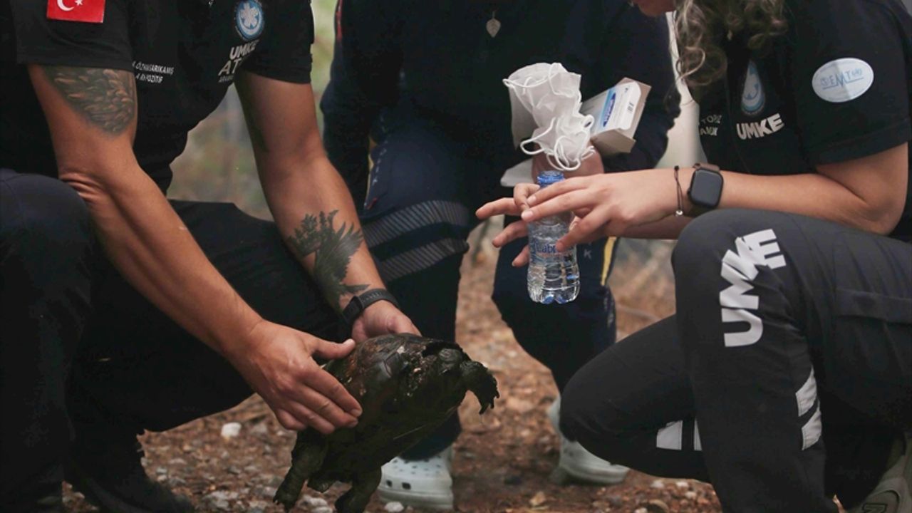 Akköprü Mahallesi'nde yangına destek için giden Muğla UMKE ekipleri, alevlerin arasında kalan bir kaplumbağa fark etti. Bitkin düştüğü ve vücudunda yanıklar oluşarak susuz kaldığı anlaşılan kaplumbağaya yardım için ekip harekete geçti.