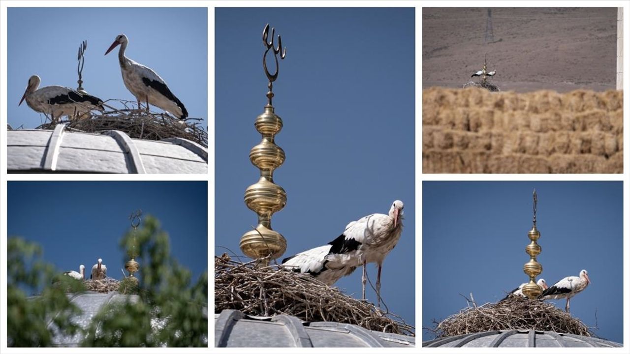 Yuva yaptıkları yapıların yıkılmasıyla leylekler yaklaşık 5 yıldır mahallede bulunan tek caminin kubbesindeki 'Allah' yazılı alemin altına yuva yapıyor.
