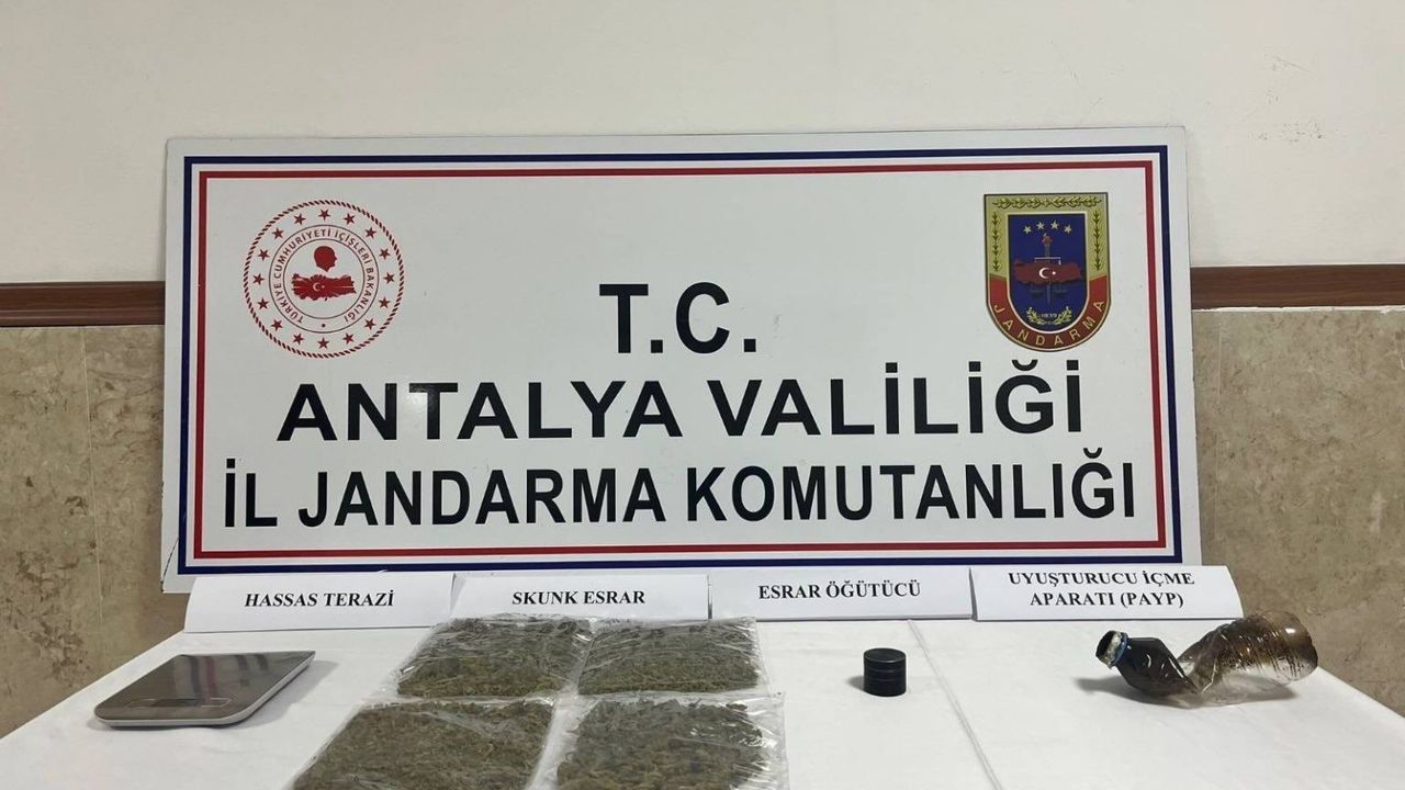 Manavgat Cumhuriyet Başsavcılığının talimatıyla Antalya İl Jandarma Komutanlığınca, uyuşturucuyla mücadele kapsamında çalışma yürütüldü. Bu kapsamda M.Z. isimli şüpheliye ait araçta ve ikamette yapılan aramalarda, 250 gram skunk, 1 adet hassas terazi, 1 adet uyuşturucu öğütme aparatı ve 1 adet uyuşturucu içme aparatı ele geçirildi.