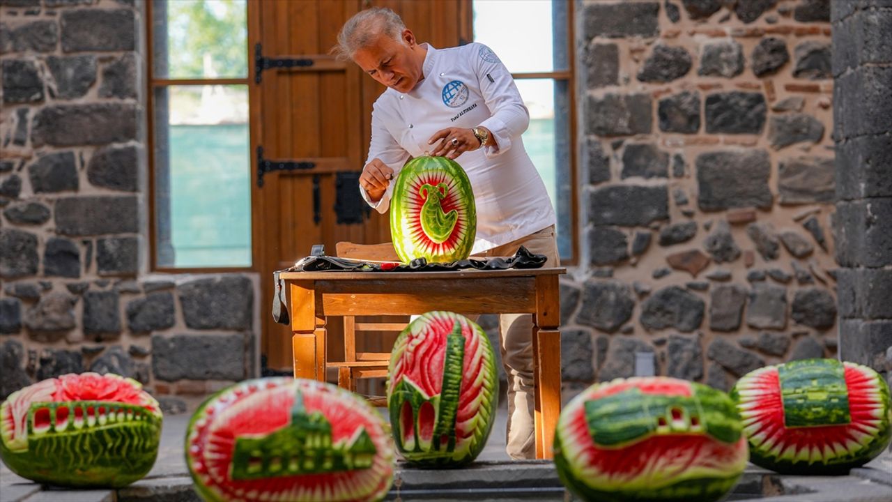 Şef Yusuf Altınkaya'nın özel bıçakları ve usta dokunuşlarıyla tarihi mekanları işlediği tescilli Diyarbakır karpuzları adeta sanat eserine dönüştü.